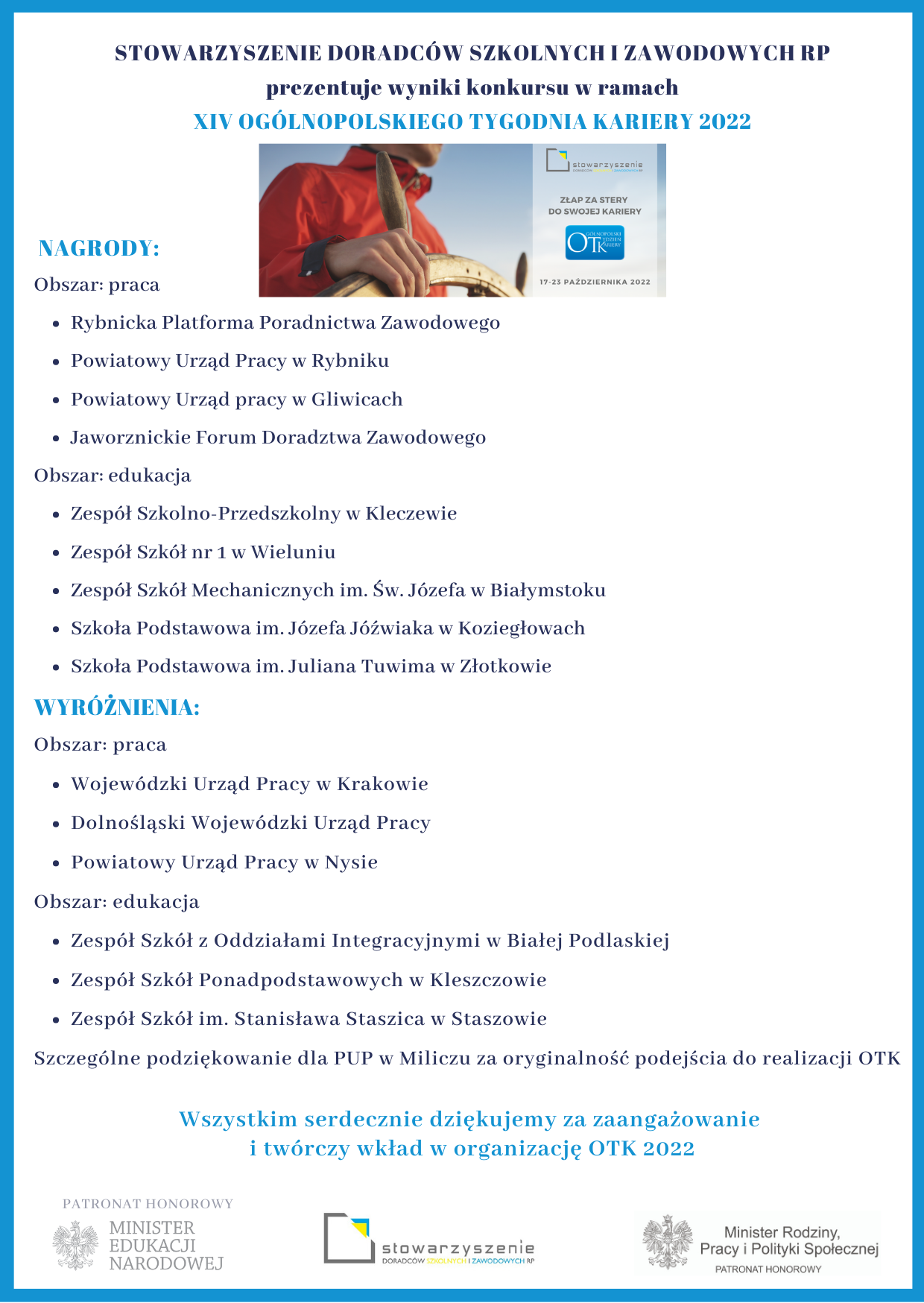 W tym roku działania realizowane przez tut. urząd w ramach poradnictwa zawodowego również zostały zauważone i docenione przez zarząd ww. stowarzyszenia. Urząd otrzymał szczególne podziękowania za oryginalność podejścia do organizacji OTK, a koordynator nagrodzonych przedsięwzięć - Agnieszka Zaradna uzyskał odznakę "Stery kariery" Ogólnopolski Tydzień Kariery 2022.