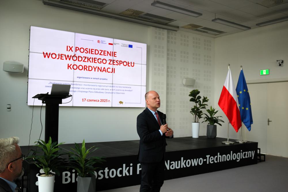 Dyrektor Wojewódzkiego Urzędu Pracy w Białymstoku Hubert Ostapowicz podczas dziewiątego posiedzenia Wojewódzkiego Zespołu Koordynacji